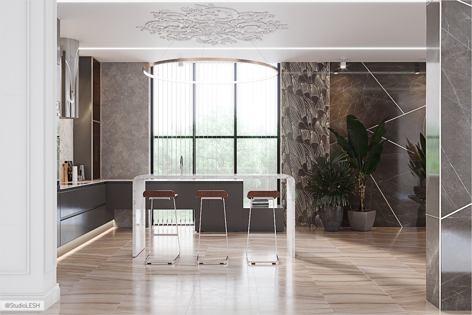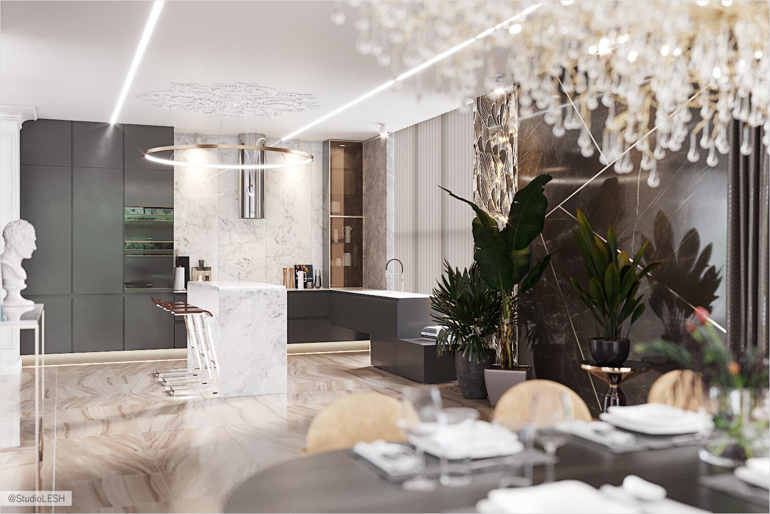 The spacious kitchen united with living room is divided into three parts: kitchen, dining area and relaxation area. In the kitchen is made a bar counter whitch is suits to the modern style, it is made of a monolithic marble slab. Its light form emphasizes the scale of space and does not clutter it. To combine the general style of the interior, the kitchen suit is made of the same stove.