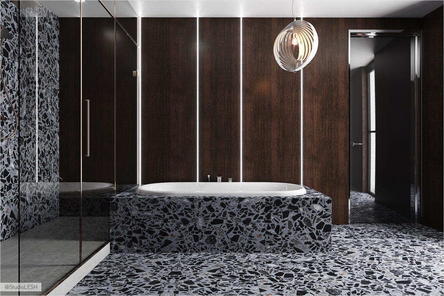 In another bathroom on the second floor feels a rhythm of a modern style, in which the entire interior of the house is made. There is a freestanding bathtub and stylish dark glass of the shower room, and also the return of the trend to tiles with glass and marble inserts - terrazo. It allowed to add a modern classic to the interior of the bathroom, which is luxuriously combined with dark wood. This combination reflects sophistication, richness, as well as the comfort of the interior as a whole.