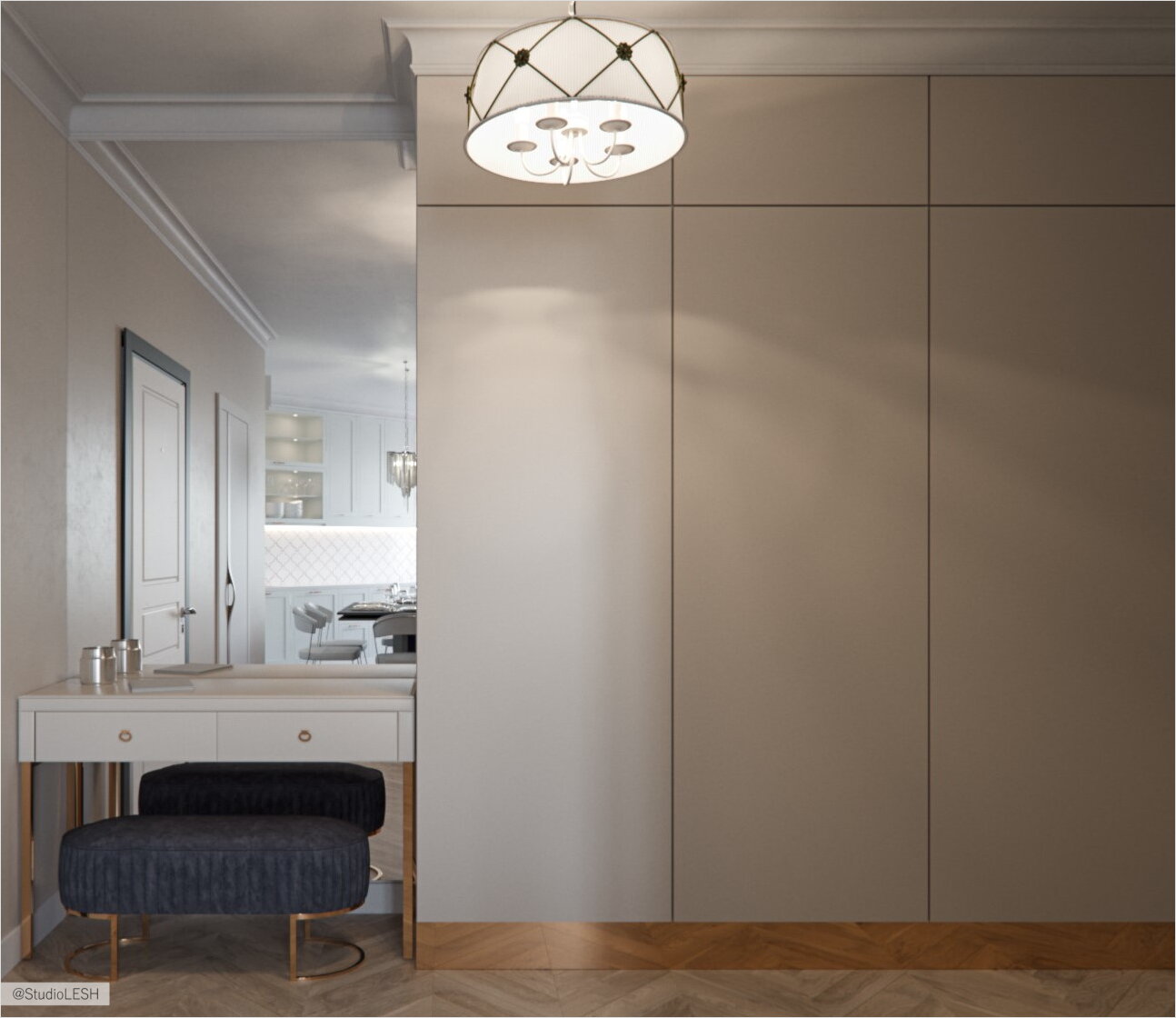 The clients set the goal: to make an apartment with separated bedroom and children room, united kitchen and living room in neoclassical style which looking neat and expensive. The interior is decorated with elegant accessories, beautiful furniture, quality materials and decor.