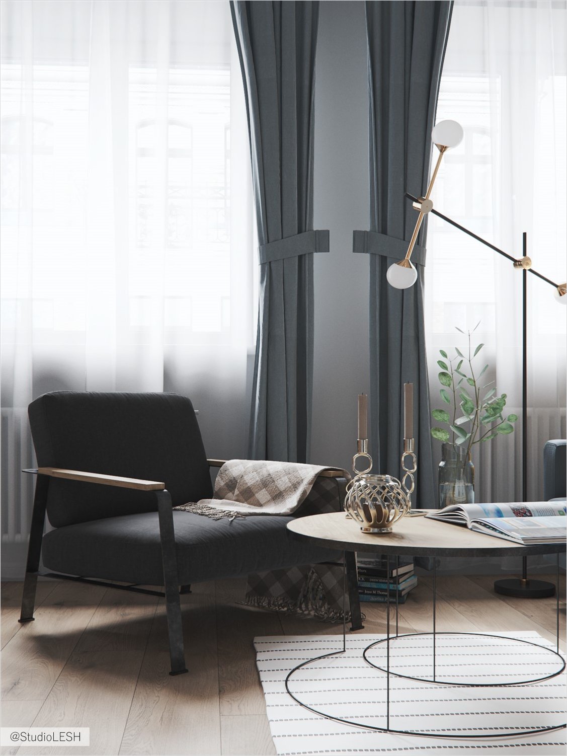 The design of the apartment is made in the Scandinavian style which is characterized by the use of calm shades and natural materials. Here, the combinations of blue, gray and brown were used in various tones and with different levels of color saturation.