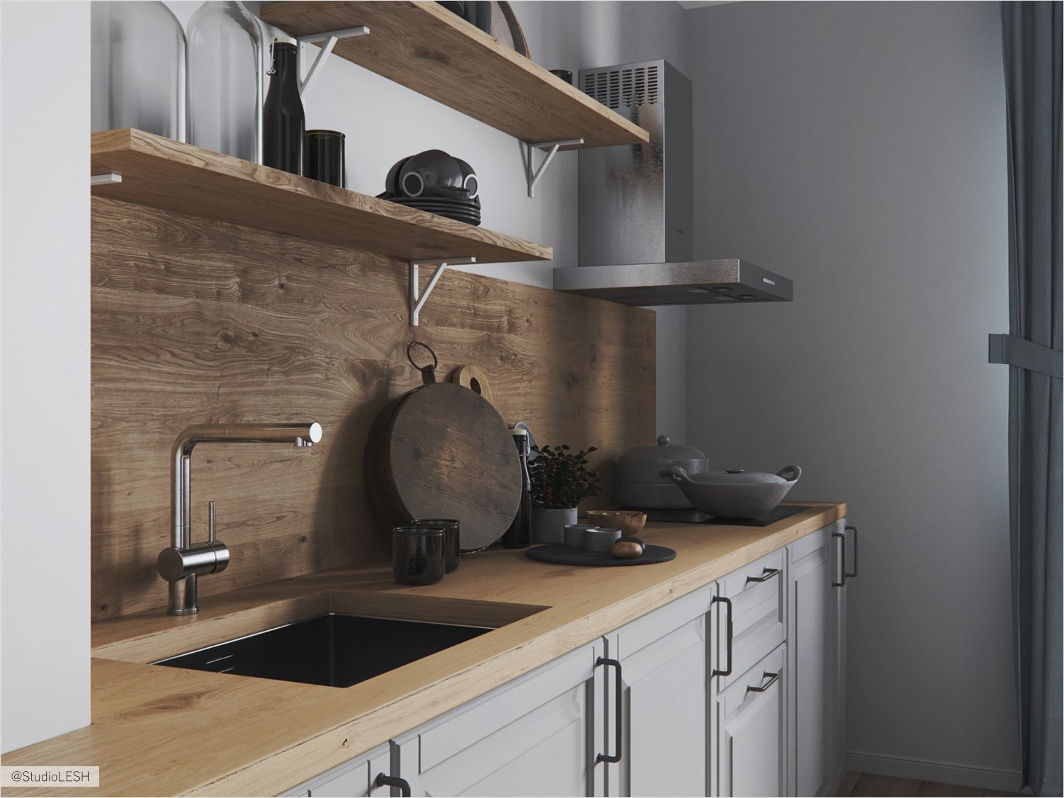 Scandinavian style involves the use of wooden elements in the interior of the apartment. That is why the table top and a kitchen suit was made of wood, to support the basic style of the apartment.