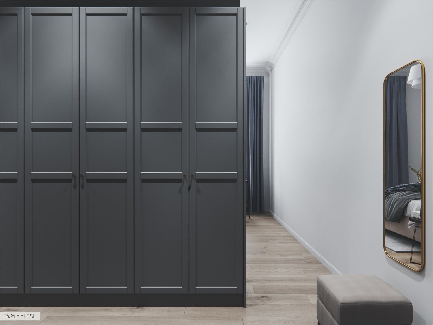 At the head of the bed was built a partition, in which aisles were made on both sides for ventilation of the dressing room. The dressing room itself is located behind this partition and it is a closed storage system consisting of cabinets from floor to ceiling. In the dressing room there is a frame pouf from the Swede collection and a vintage full-length mirror in a brass frame that unites the style of the dressing room with a bedroom.
