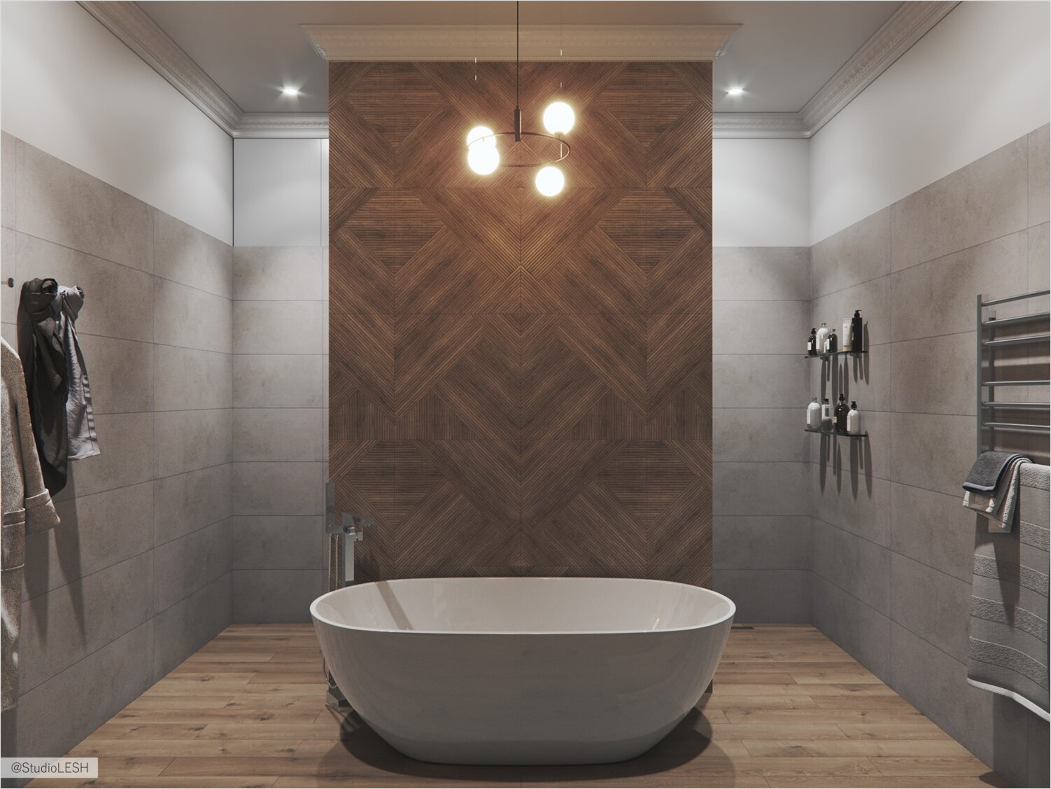 Spacious bathroom — it is a possibility to make a functional zoning of the space, which is very important for the family. The layout of the bathroom is similar with bedroom when we enter we see the outstanding bath which is outlined by the light of lamp Maytoni from the collection Ring.