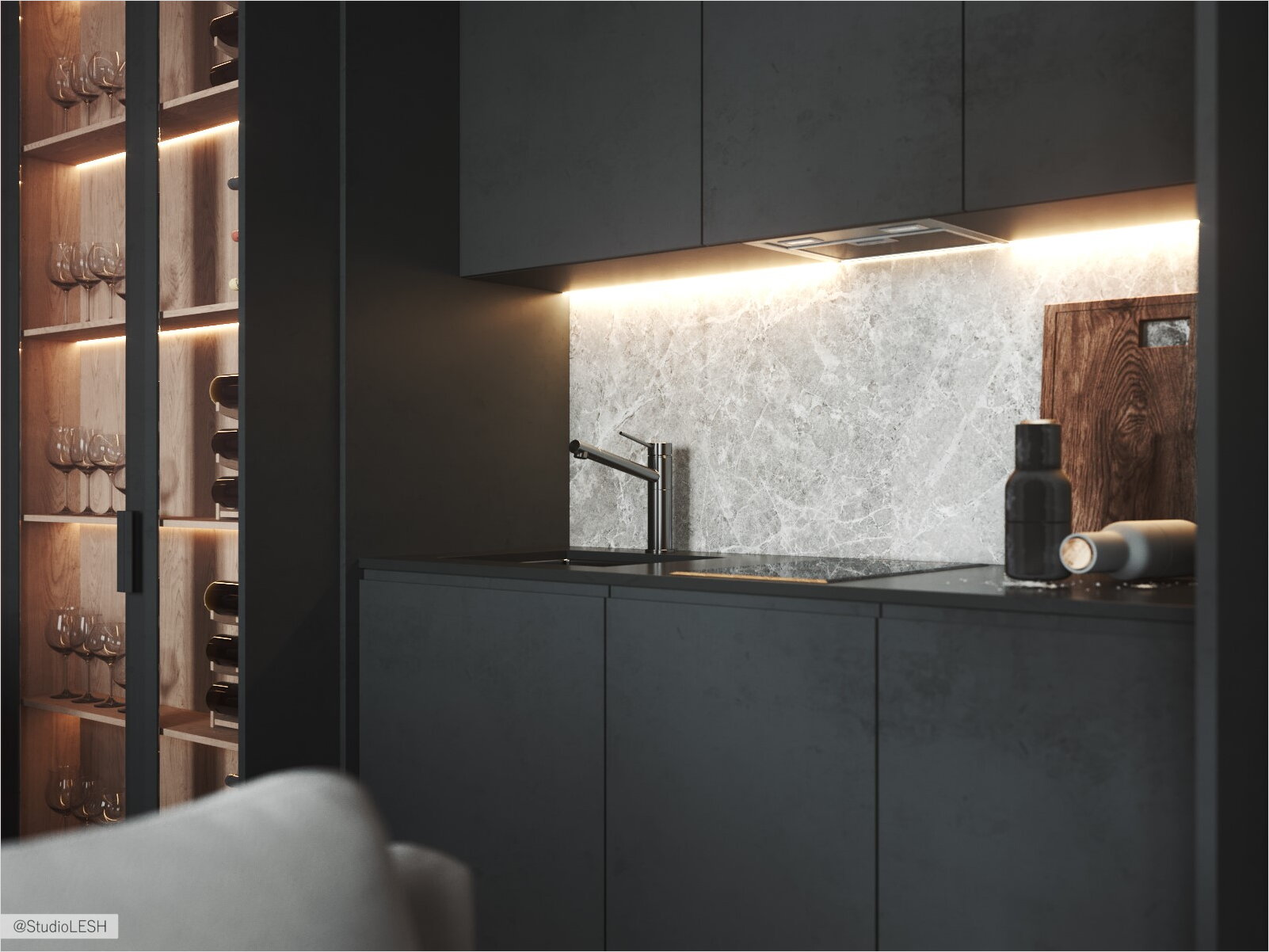 A man turned to our studio to order a design project for his apartment. It was decided to design: the combined space of the hallway-kitchen-living room, bedroom, guest room, and one bathroom on an area of ​​77 m². The style of the apartment is designed in a modern style, it was necessary to create a convenient, comfortable space of a modern city apartment.
