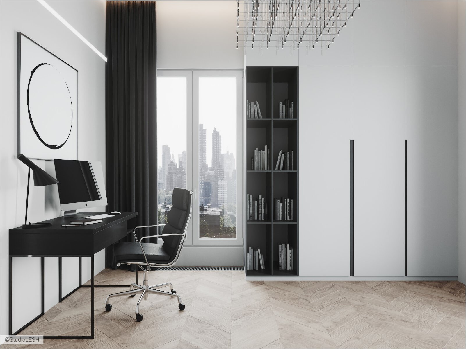 The apartment also has a guest room, which is normally used as an office. Here is a comfortable desktop with an abstract picture that balances the contrasting composition of the monochrome interior.