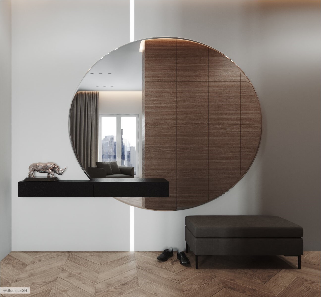 In the hallway, a huge round mirror  has also become an element of leveling, it was made with a light hanging console which crashes into the mirror. A mirror of this diameter (2 m) is not easy to make, but possible. In this case, the mirror and the console were made by the same supplier, because it was necessary to provide for the console to have place under the mirror so that everything looked neat and natural.