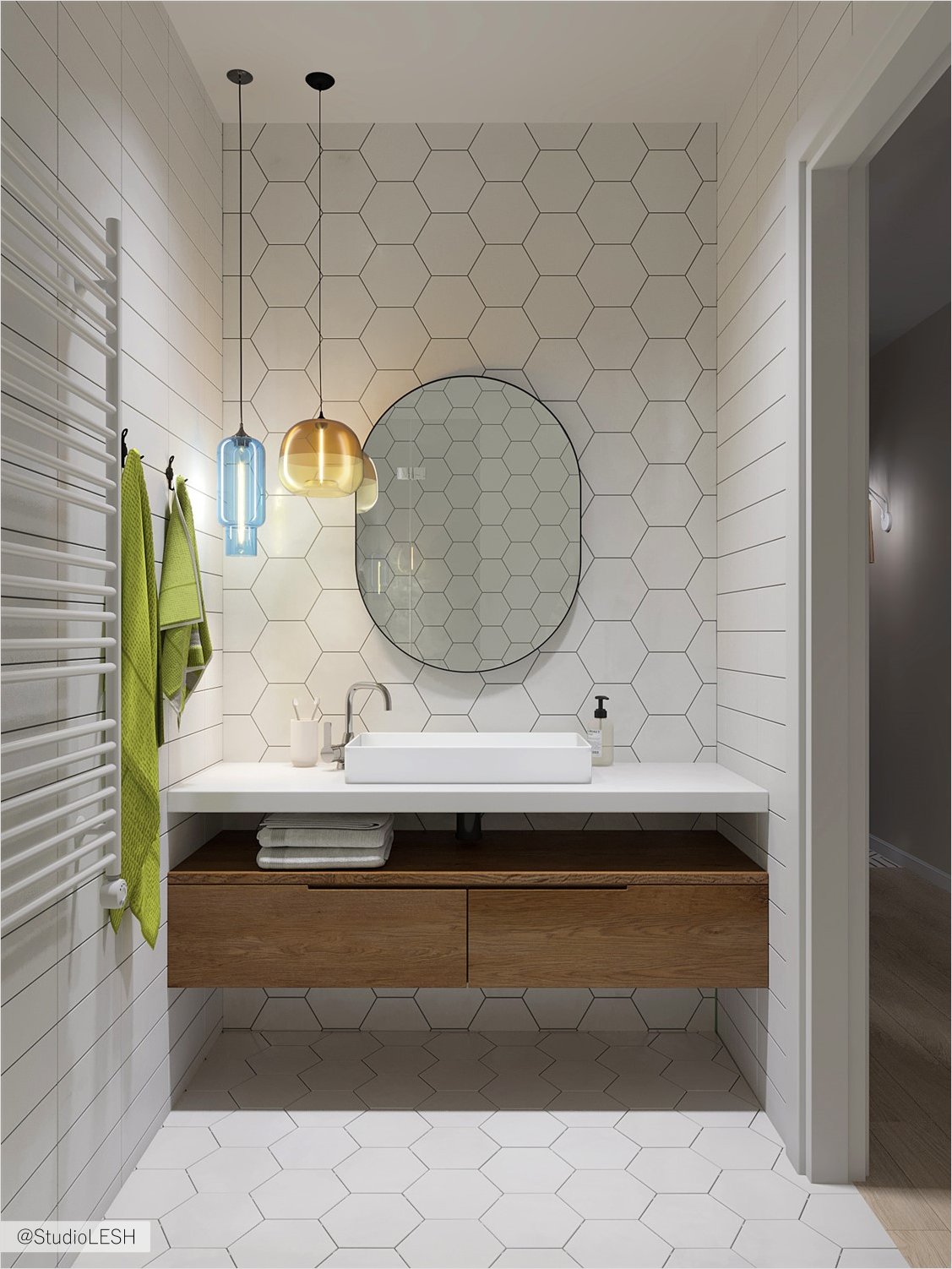 Considering the overall style of the apartment, it was necessary to choose such a tile format so that the colour of the walls stand neutral, but at the same time maintained the rhythm set in the whole apartment. Thus, it was chosen a tile mosaic made in various geometric shapes in order to preserve the atmosphere created in other rooms and at the same time create a unique design in each room.