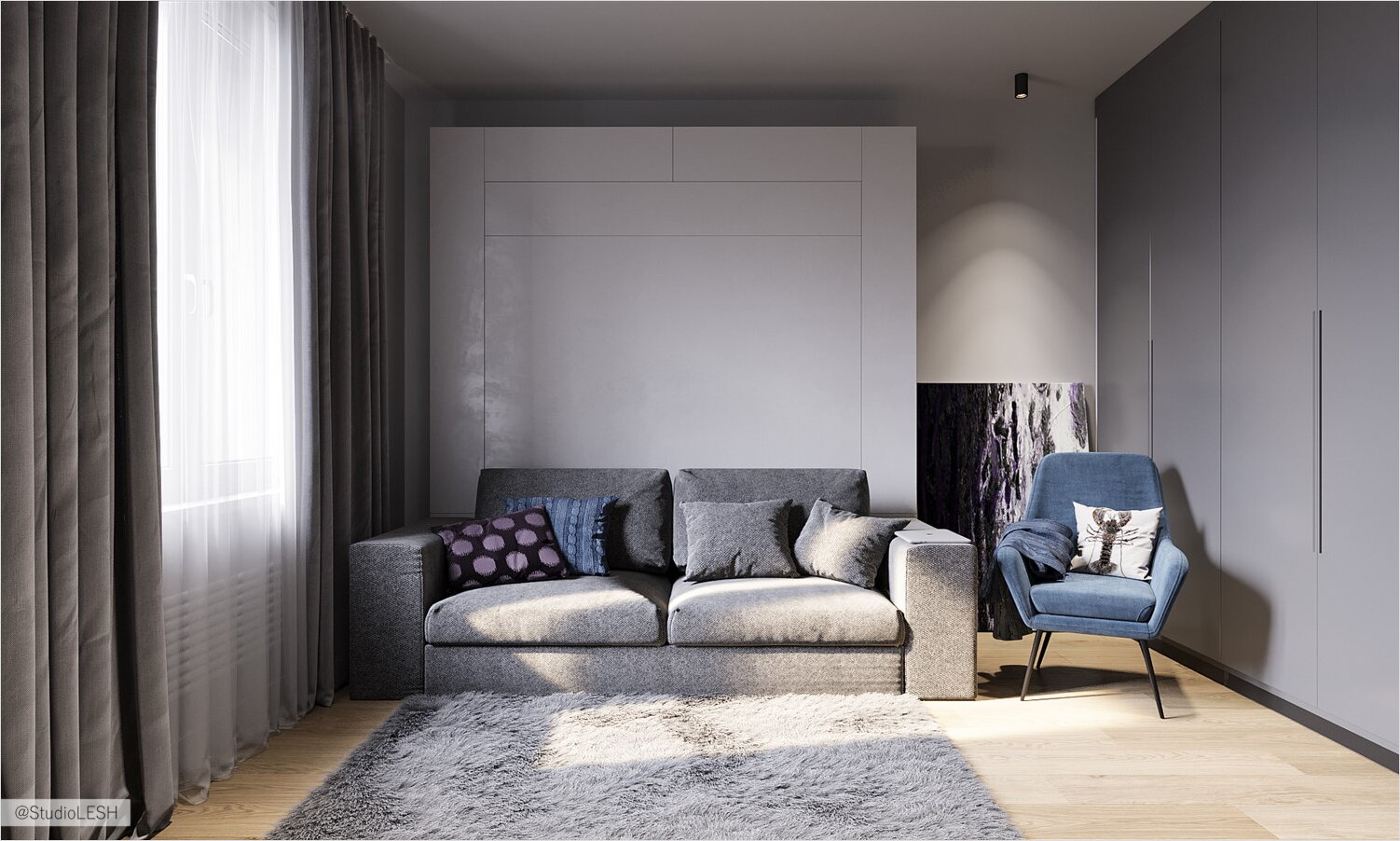 The apartment is decorated mainly in gray shades with accents on purple, lilac and blue colors. Several elements combine a common style with accents, for example, the picture in the bedroom combines the whole color scheme of the project from white to blue, then purple and dark gray that is almost black.