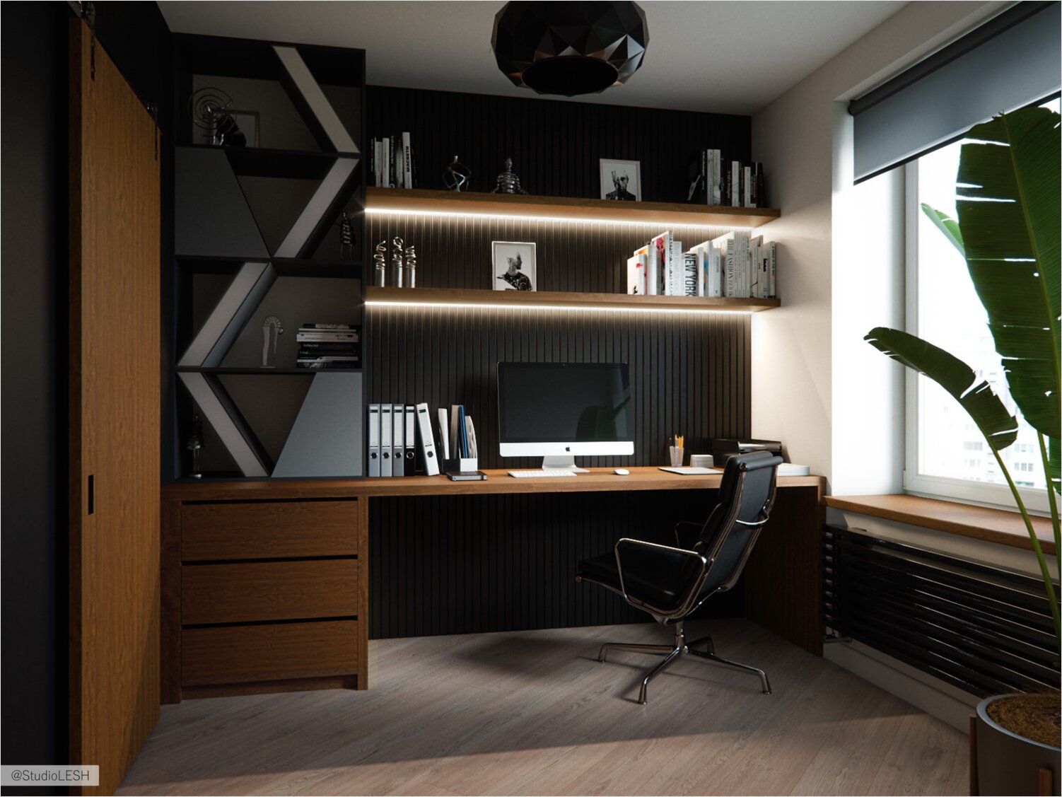 На этапе обсуждения планировки встал вопрос о том, что заказчикам был необходим отдельный кабинет для работы дома. Ввиду большой площади гостиной  было принято решение отделить кабинет в гостиной. Также там были возведены перегородки для создания гардеробной, но таким образом в гостиной не осталось ни одного источника естественного света.