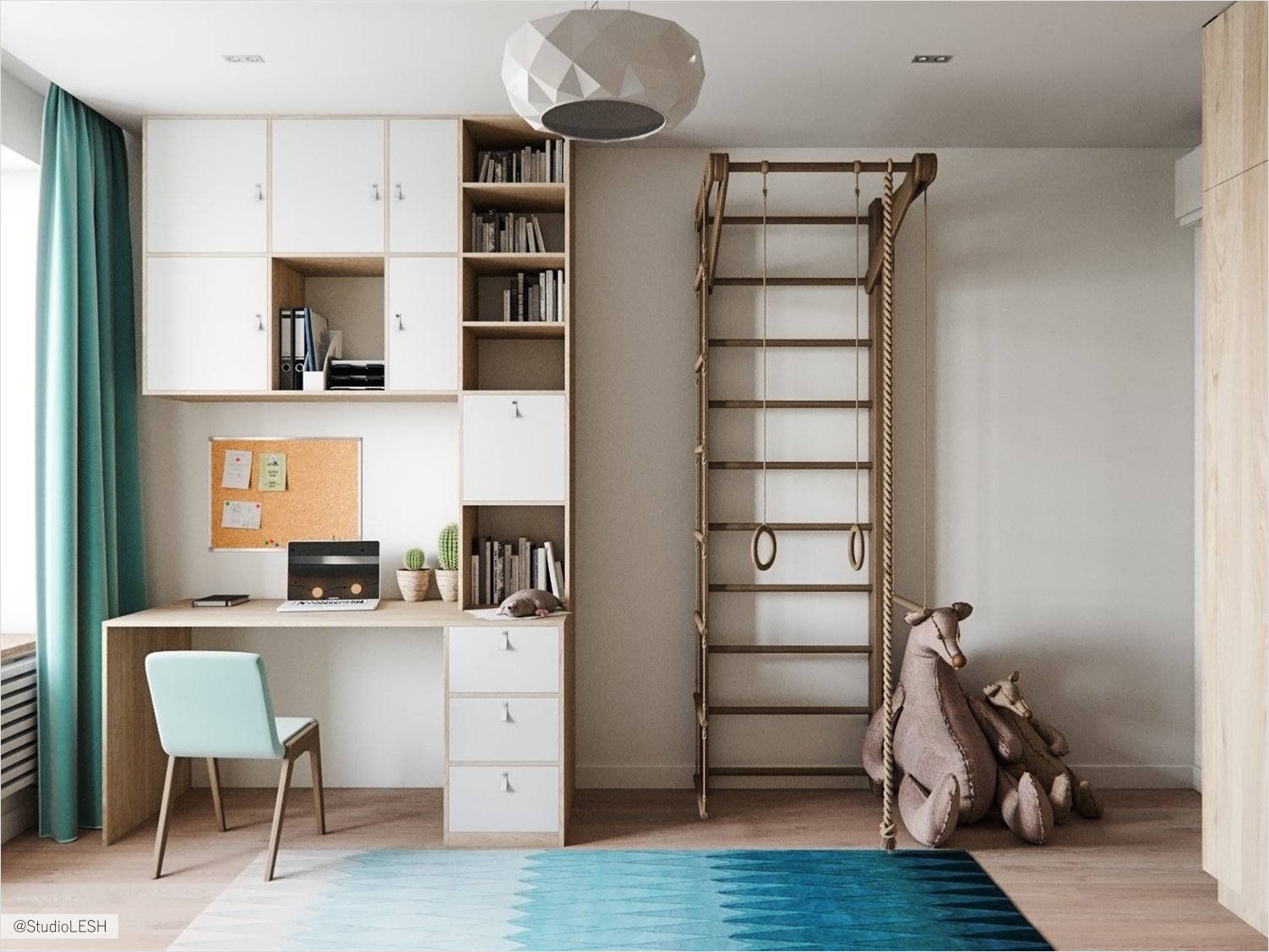 На сегодняшний момент комната похожа на детскую за счет ярких акцентов и деталей подчеркивающих данную атмосферу: яркий ковер, шторы, игрушки и кровать в виде домика. Кровать сделана таким образом, чтобы всё постельное бельё можно было убрать в ящики под кроватью и организовать в домике игровую зону.