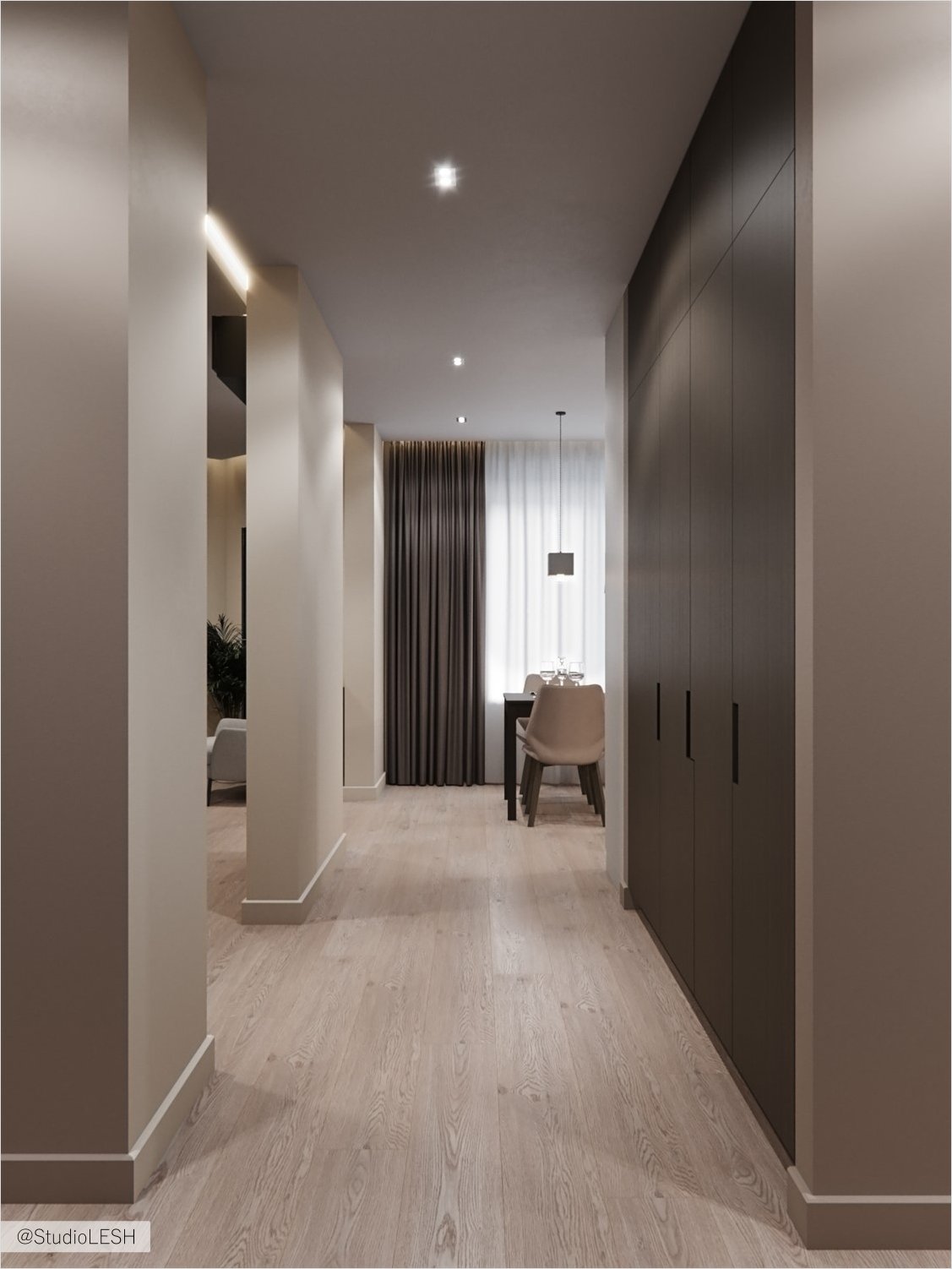 Помимо гардеробной в этом проекте есть еще система хранения в виде шкафов от пола до потолка в прихожей. Вместе с верхней одеждой здесь также расположился шкаф со стиральной машиной и сушильной машиной, для увеличения пространства в ванной комнате.