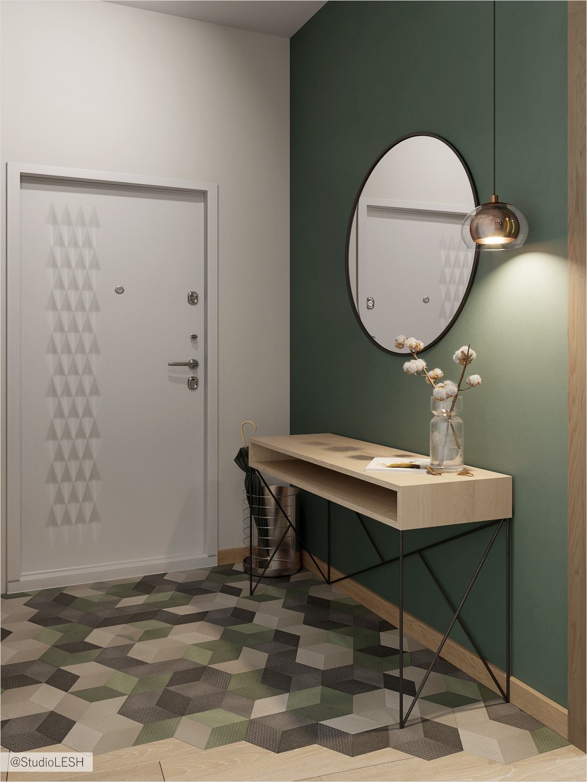 При использовании в прихожей плитки нередко возникает вопрос, как оформить переход к другому напольному покрытию. Если в случае с кухней или санузлом резкий переход выглядит уместно, то на стыке прихожей и гостиной это не всегда так. Дизайнер предложил использовать шестиугольную плитку для создания нервной границы, делая переход из одной зоны в другую плавным и ненавязчивым. Не маркий серый цвет разбавляет вставки изумрудного керамогранита, который является основным цветом в интерьере. Еще одна связующая нить с общей концепцией квартиры это — геометрические формы, задействованные во всей обстановке.