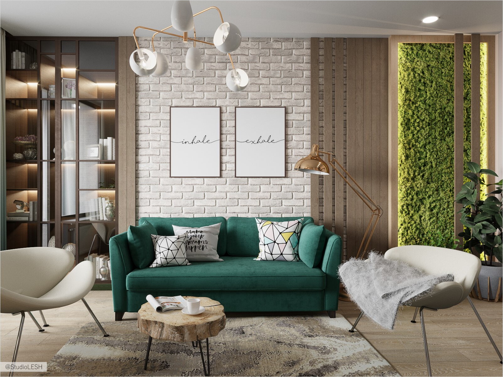 Гостиная является более насыщенным и динамичным пространством. Изумрудный диван, приставной столик из слэба, фактурная кирпичная стена, реечная система и стабилизированный мох — звучит как набор дизайнерских приемов, но все это умещается в одной гостиной. Все элементы дополняют или выделяют друг друга, таким образом пространство яркое, броское и удобное для жизни.