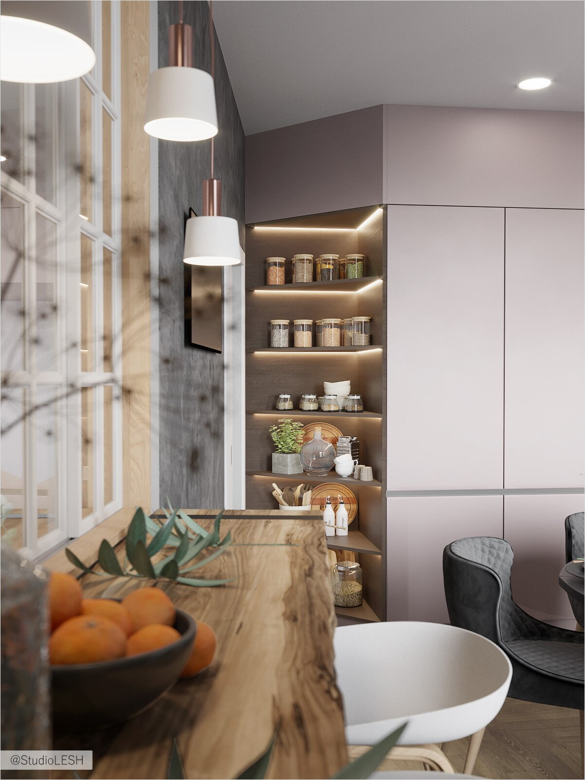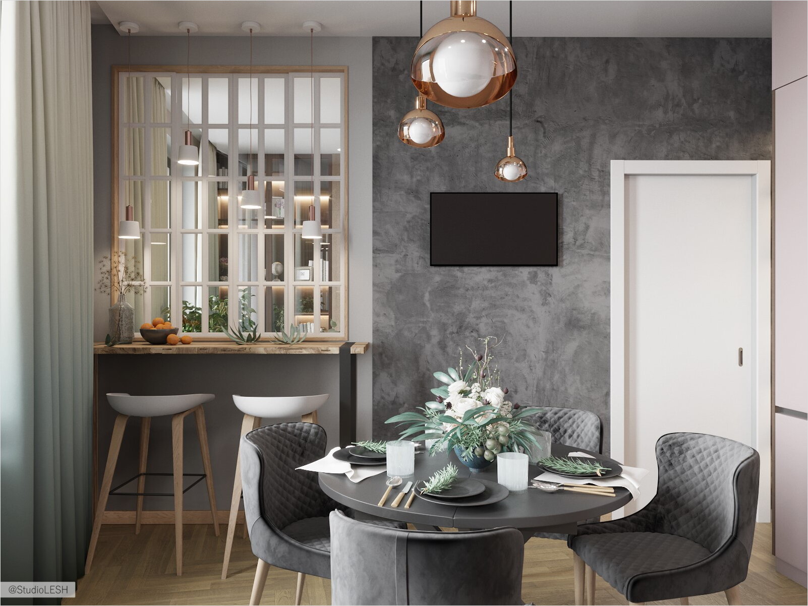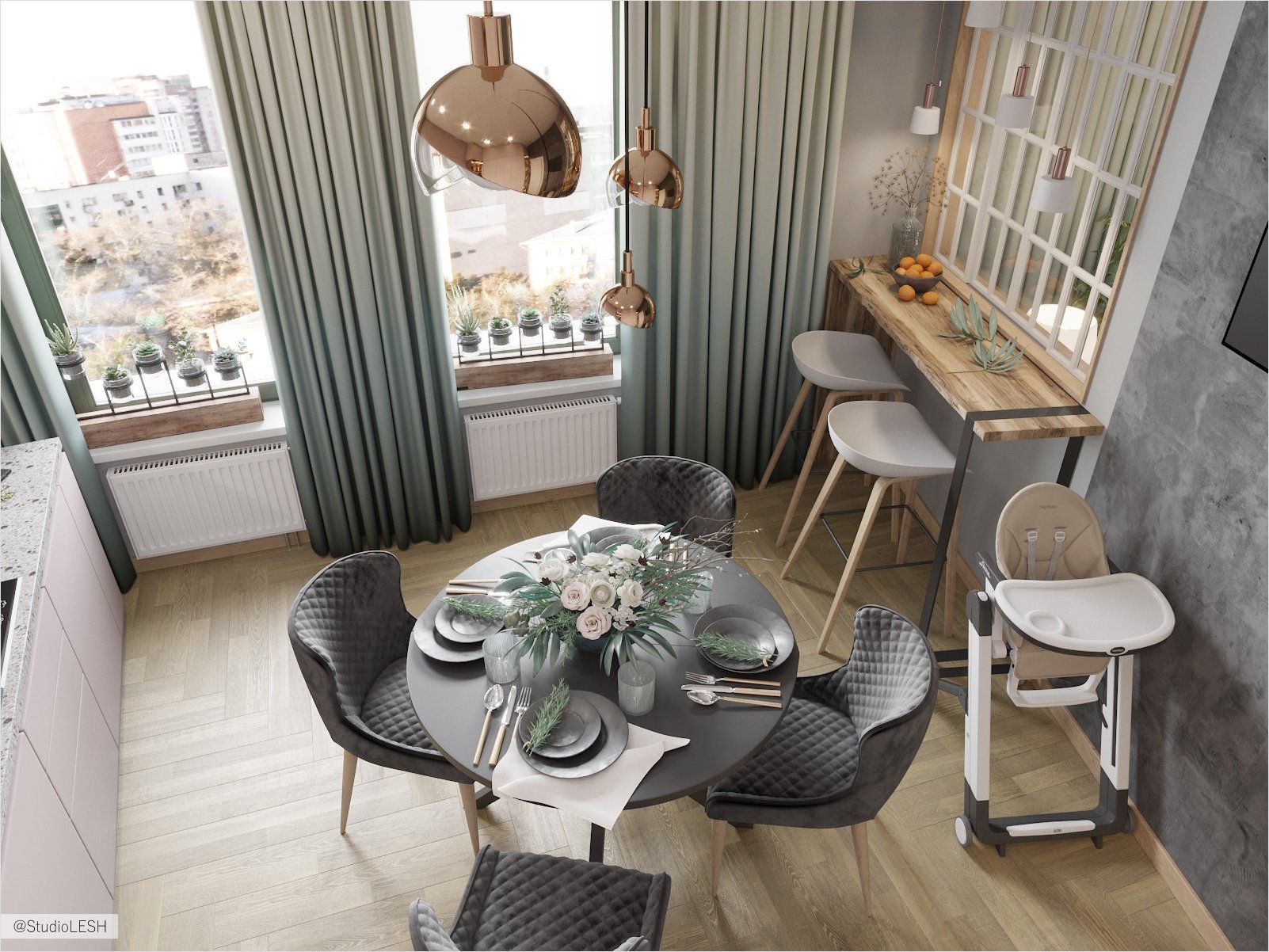 Кухня более воздушное и легкое пространство, в основном за счет стен и кухонного гарнитура оформлены в светлых тонах. Обеденная группа также выдержана в спокойном сером цвете. Таким образом акцентом пространства становится изумрудный фартук с геометрическим рисунком и барная стойка из натурального дерева, которая располагается вдоль межкомнатного окна.