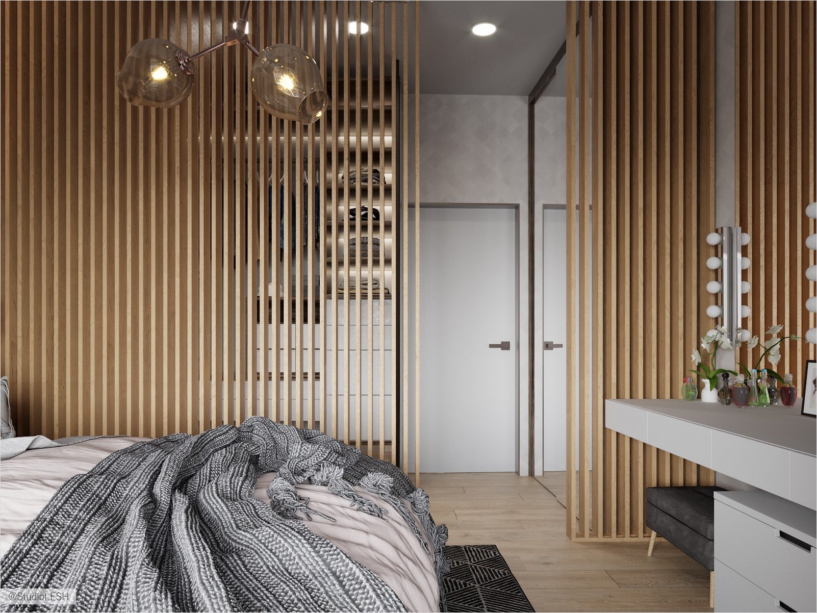 Использование элементов из дерева поддерживает композицию квартиры, объединяя пространства единой тематикой. А применение деревянных реечных перегородок дает возможность для плавного разделения зон уютно спальни и вместительной гардеробной. Рейки отлично пропускают естественный свет, что сохраняет пространство живым. За счет встроенного зеркального шкафа гардеробная кажется больше и просторнее.
